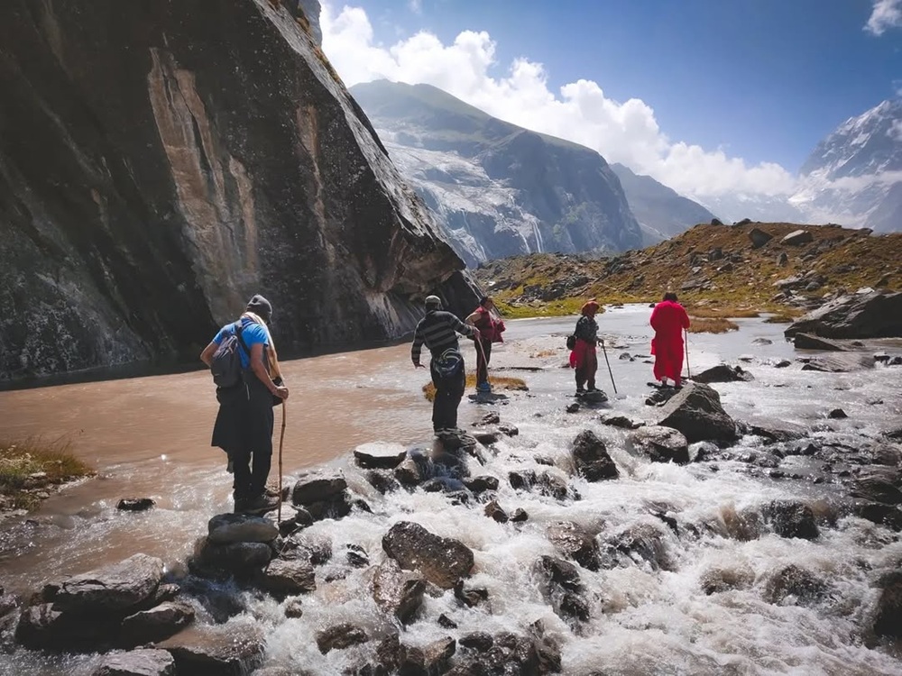 The glacial waters from the Alakapuri Glacier flow into the Alaknanda River and first collect in Satopanth Lake. Beyond Satopanth, the most difficult terrain is the Heavenly Ascent (Swargarohini).